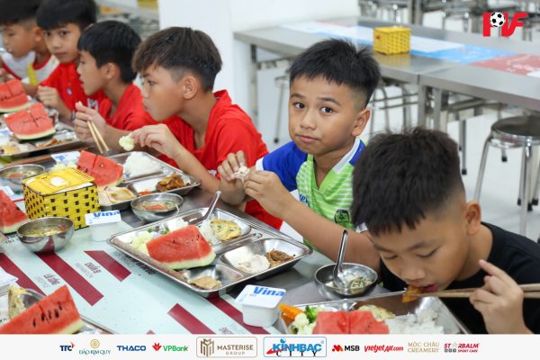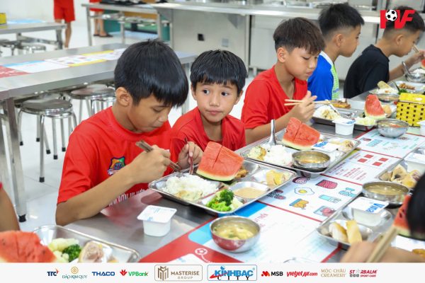 Những bữa ăn được chuẩn bị đầy đủ dinh dưỡng, đảm bảo cân đối giữa các nhóm chất nhằm giúp các thí sinh bổ sung năng lượng, phục hồi thể lực và duy trì trạng thái tốt nhất trong suốt quá trình tham gia tuyển chọn. Đây cũng là một phần quan trọng trong môi trường đào tạo tại PVF, nơi chế độ dinh dưỡng luôn được xây dựng khoa học, phù hợp với lứa tuổi và cường độ vận động của các cầu thủ trẻ.