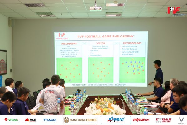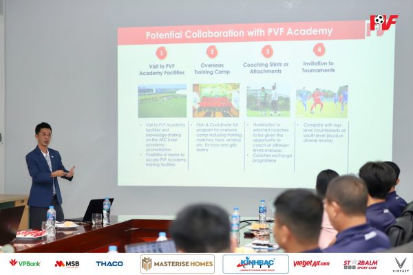 Đoàn đã nghe chia sẻ từ các bộ phận chuyên môn của PVF về công tác đào tạo và phát triển cầu thủ, đánh giá cao việc PVF đã đạt được sự công nhận của AFC về tiêu chuẩn Học viện bóng đá 3 sao AFC Elite Academy, cũng như những kết quả đã đạt được trong xây dựng học viện, vận hành cơ sở vật chất, sự toán diện trong hệ thống nhân sự chuyên môn và ứng dụng khoa học vào phát triển cầu thủ.