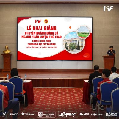 Sáng 10/11, Lễ khai giảng khóa 61 (2025 – 2030) Lớp Bóng đá – Huấn luyện thể thao hệ vừa học vừa làm Trường Đại học Thể dục & thể thao Bắc Ninh đã diễn ra tại Trung tâm Đào tạo Bóng đá trẻ PVF. Buổi lễ có sự tham gia của ban lãnh đạo PVF, ban giám hiệu Trường Đại học Thể dục & thể thao Bắc Ninh và các học viên trúng tuyển.