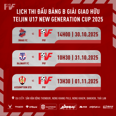 U17 PVF sẽ thi đấu 3 trận trong 3 ngày liên tiếp tại giải Teijin U17 New Generation Cup 2025 gặp các đối thủ tới từ Thái Lan (chủ nhà) và Nhật Bản. Mỗi trận đấu có thời lượng 35 phút mỗi hiệp và 10 nghỉ giữa hiệp. Tất cả các trận đấu của U17 PVF đều được trực tiếp trên fanpage Trung tâm Đào tạo Bóng đá trẻ PVF – Bộ Công An và kênh Youtube PVFFootballAcademy.